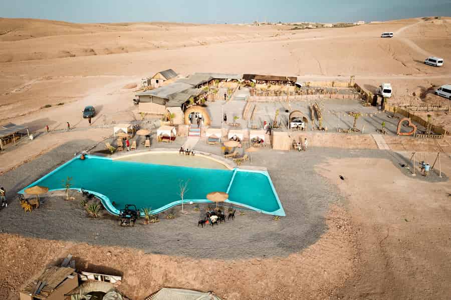 Begib dich auf ein nächtliches Abenteuer in der Agafay-Wüste. Entspann dich und erfrisch dich in einem atemberaubenden Wüstenpool, schlaf in einem luxuriösen Zelt unter dem Sternenhimmel und bewundere den atemberaubenden Sonnenuntergang und Sonnenaufgang.